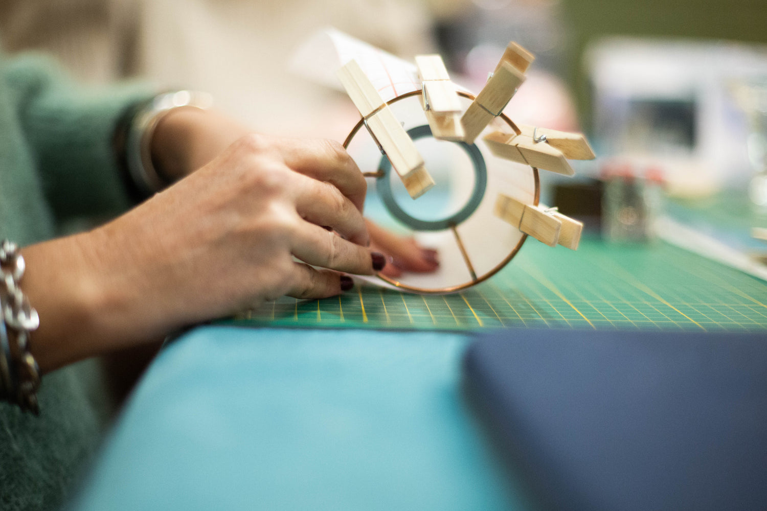 A sa table de travail, la créatrice s’active. Le geste ample et sûr. Une accumulation de jolies petites boîtes anciennes, un nécessaire de couture, une ou deux carcasses, pêle-mêle et des tissus d'exception à foison : Romo, Clarke & Clarke, James Hare, les britanniques ont sa préférence.