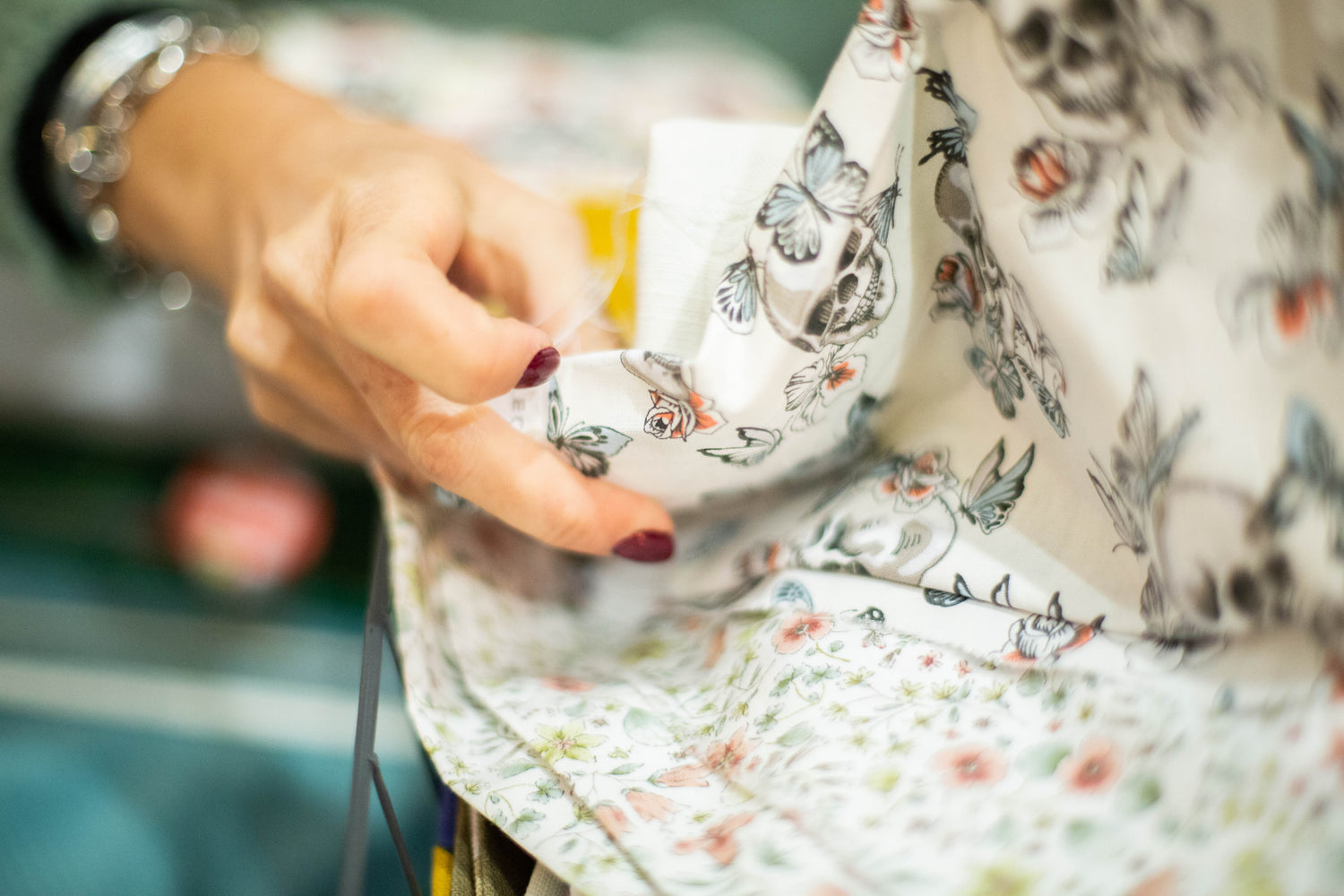 Partout des rouleaux d'étoffes, des matières luxueuses qui racontent une histoire, quelques baladeuses et des passementeries raffinées négligemment accrochées aux portes ouvertes de vieilles et élégantes armoires en bois qu’on imaginerait volontiers dans un décor d’antan. Tapissées de fleurs, elles débordent d’échantillons en tous genres, franges et galons découverts au gré des vide-greniers. L’artisane s’est créé un monde à part, à l’ambiance singulière, composé d’élégants froufrous.