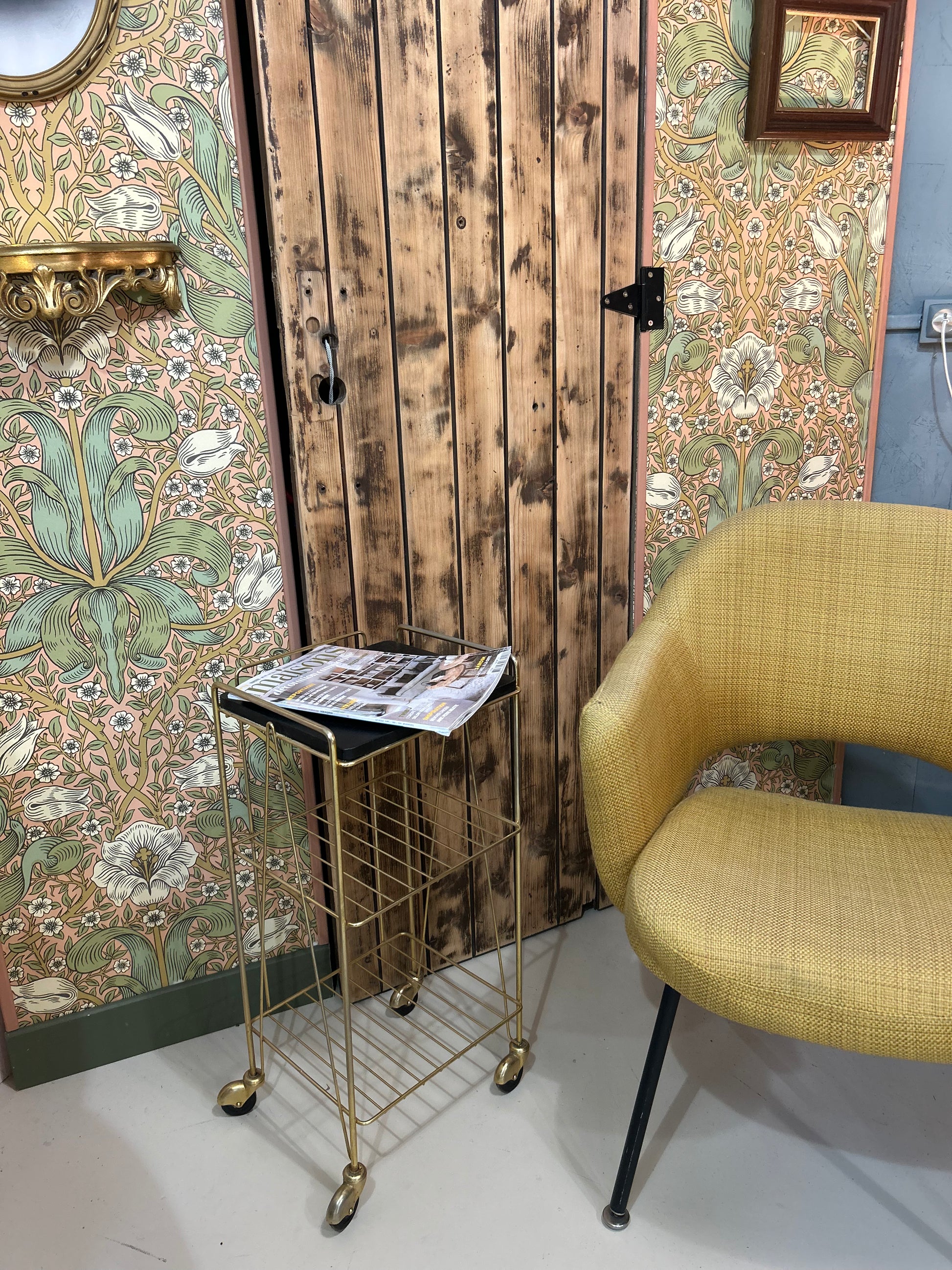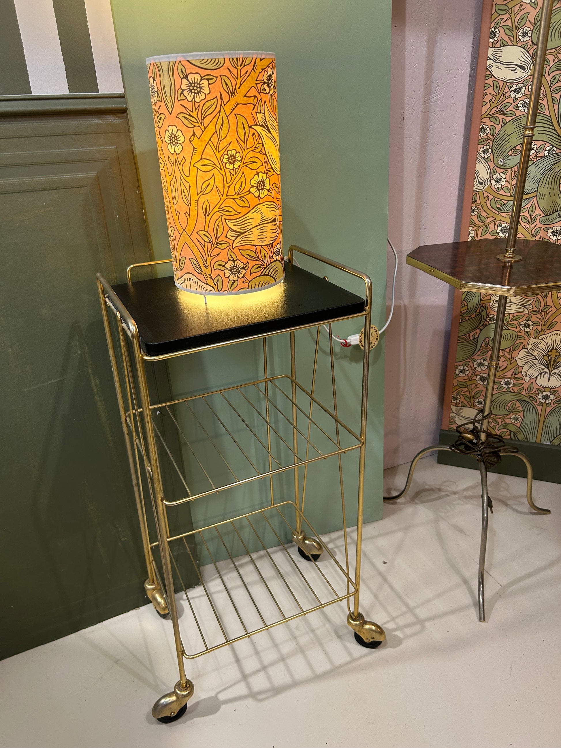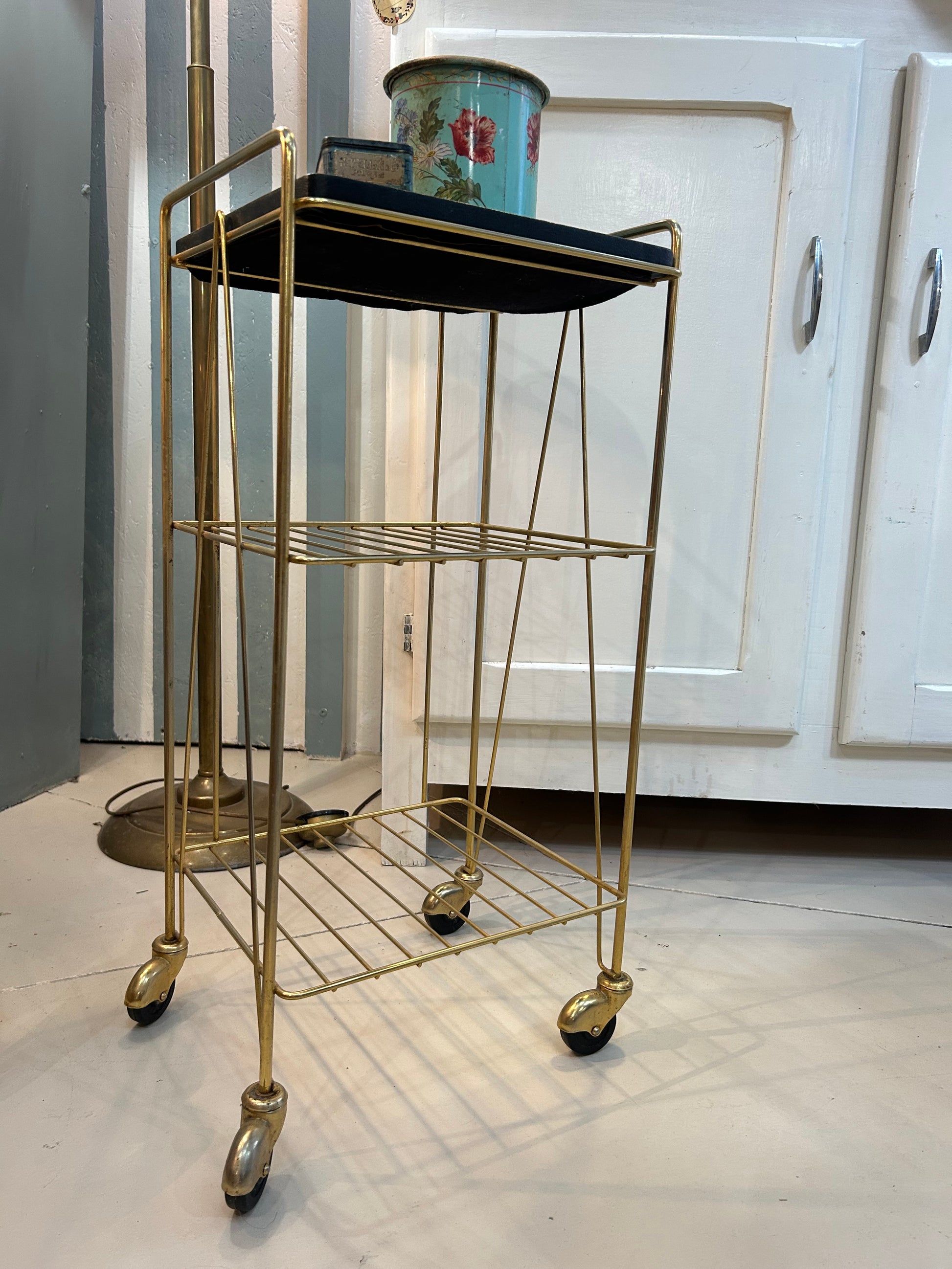 Avec son allure chic et légère, cette desserte roulante dorée nous replonge dans l'élégance des intérieurs des années 60/70. Sa structure fine et ses roulettes d'origine en font un petit meuble aussi pratique qu'esthétique.