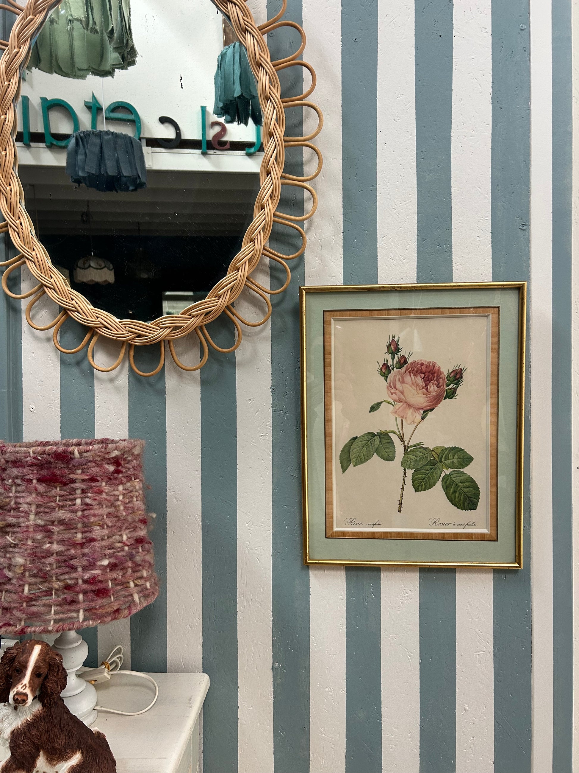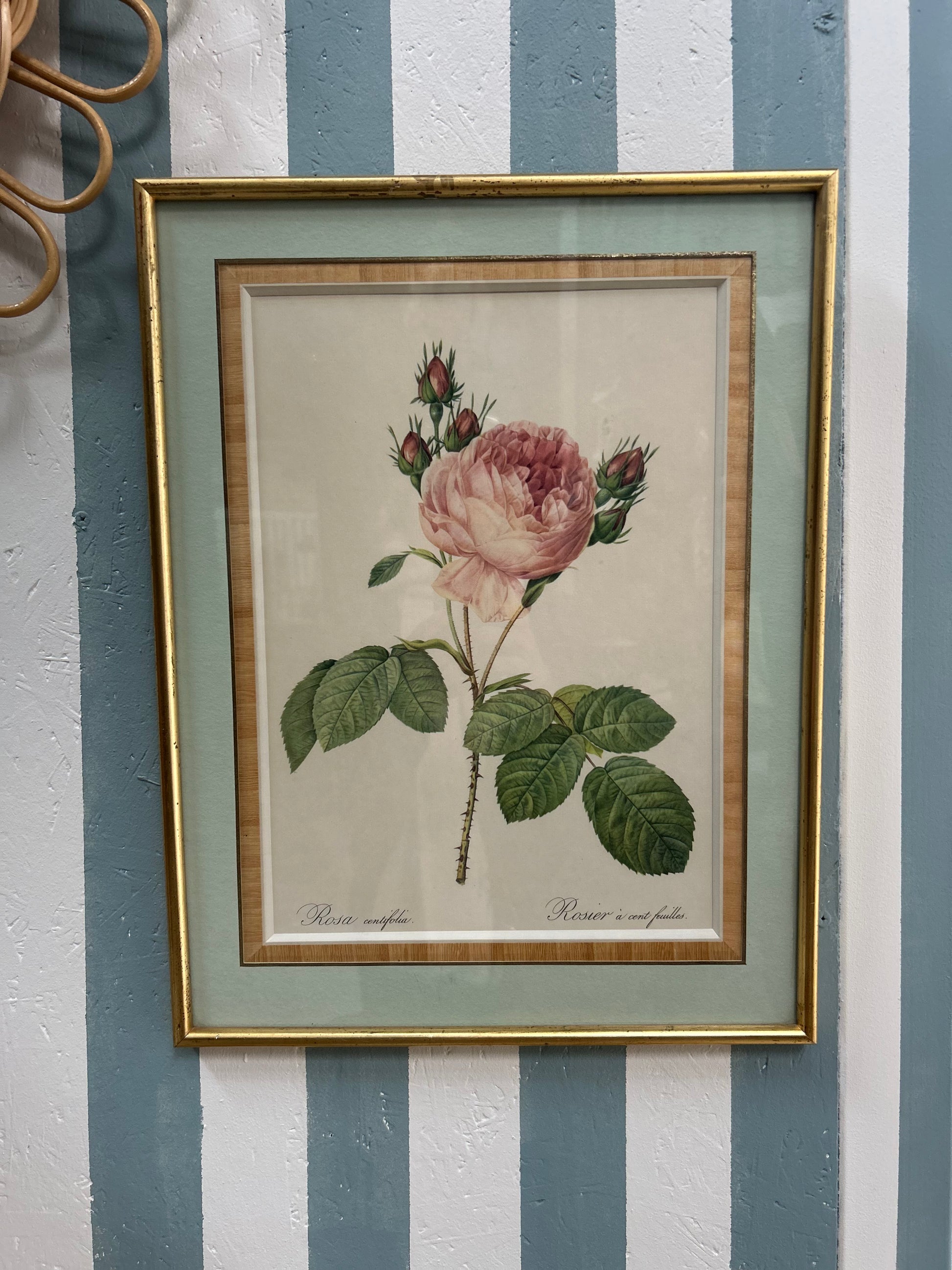Gravure botanique, délicatement aquarellée, illustre le rosier à cent feuilles (Rosa centifolia), emblématique des jardins anciens. Son encadrement doré et vert pastel rappellent l'élégance des intérieurs d'autrefois, tout en s'accordant parfaitement avec une décoration contemporaine.